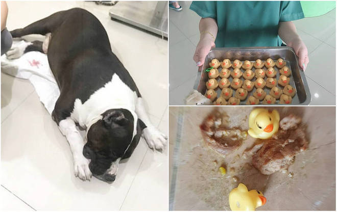 32 patos de borracha foram removidos do estômago de um cachorro durante uma cirurgia de emergência realizada em uma clinica veterinária de Pattanya, na Tailândia. As informações são do tabloide britânico Daily Mail