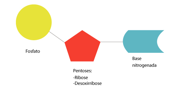 bases nitrogenadas pentose: carboidrato composto por cinco carbonos fosfato: um radical de ácido fosfóricoO DNA é formado por duas fitas, chamadas de cadeias de polinucleotídeos. Essas fitas são constituídas por vários nucleotídeos, unidos por ligações fosfodiéster (grupo fosfato ligando dois açucares de dois nucleotídeos) formando uma cadeia principal.