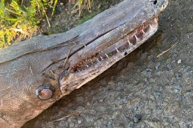 O animal tem cerca de 1,5 m e uma boca com dezenas de dentes afiados. Ele foi ainda avistado por outras pessoas que passaram por ali. Online, alguns afirmaram se tratar de um jacaré gar, um peixe com a aparência do réptil, que é típico da América do Sul. Mas o tamanho da criatura encontrada sugere um animal pelo menos 50% maior