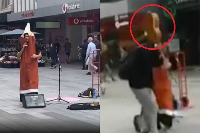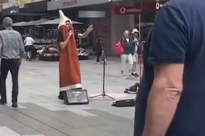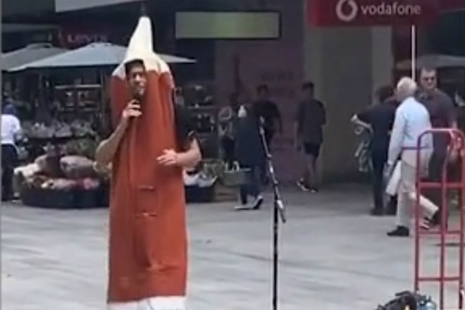 Segundo o tabloide Daily Mail, Matt Eberhart realizava uma parodia da canção I Will Survive, em frente a um shopping de Adelaide, na Austrália