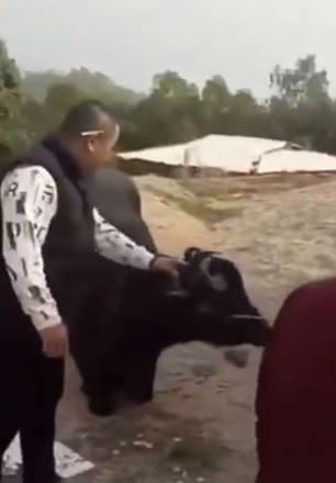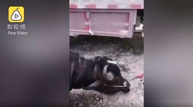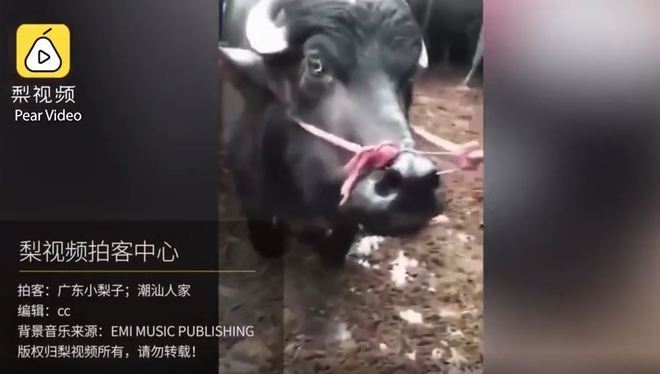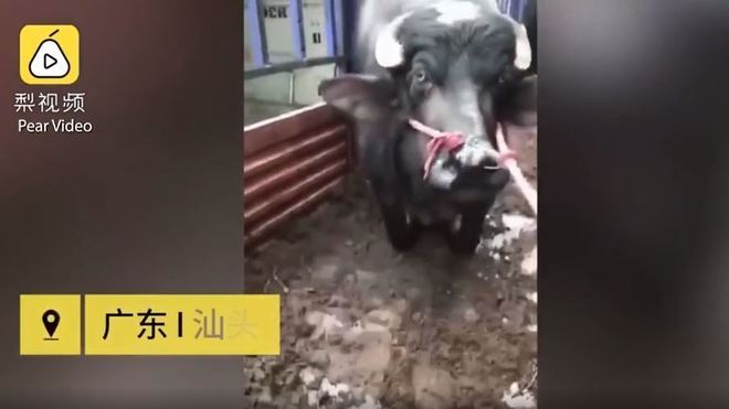 A gravação começa com a vaca sendo levada para um matadouro de Shantou, na província de Guangdong