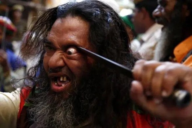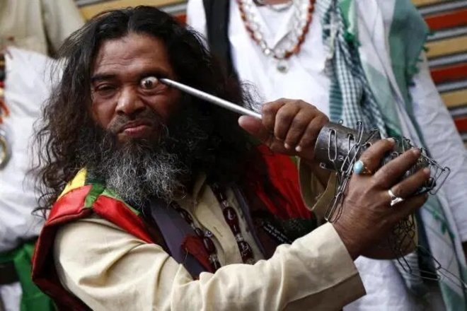 Os participantes usam facas e espadas para tirar os olhos das órbitas e puxar fios de metal pelas línguas e bochechas em um festival na Índia