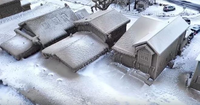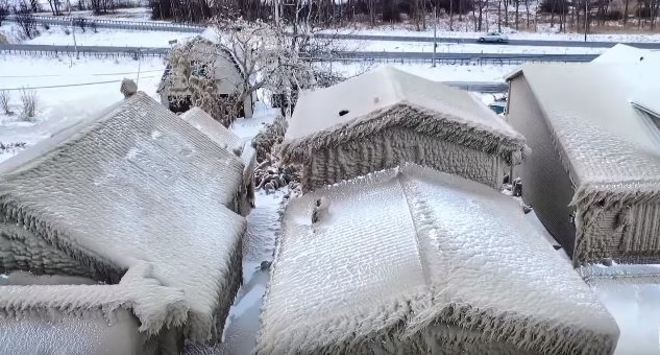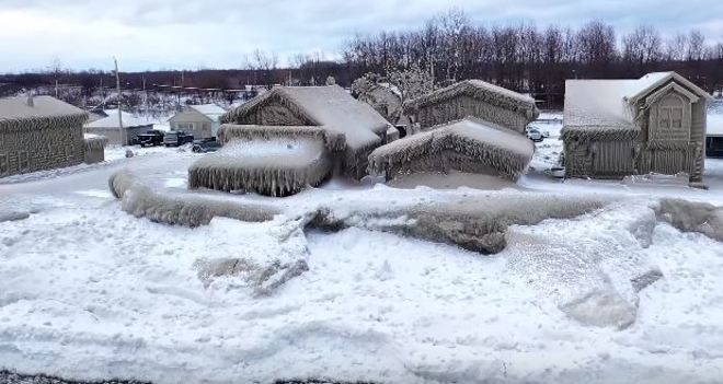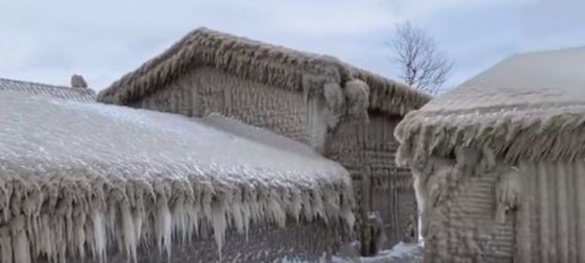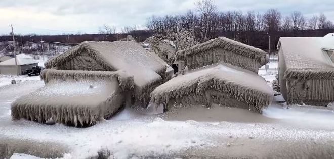 Esse cenário digno do filme Frozen foi criado quando os fortes ventos sopraram a água do lago em direção às casas, que congelaram