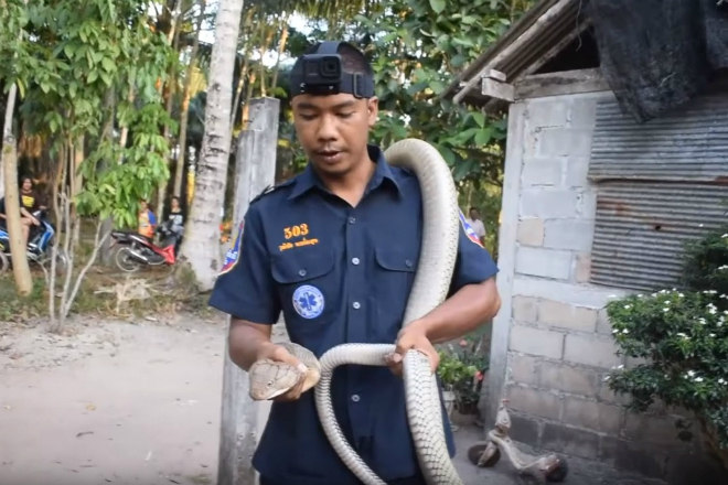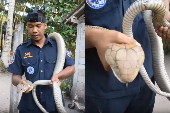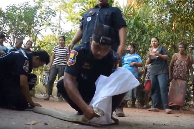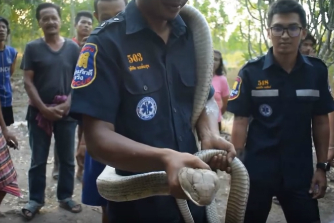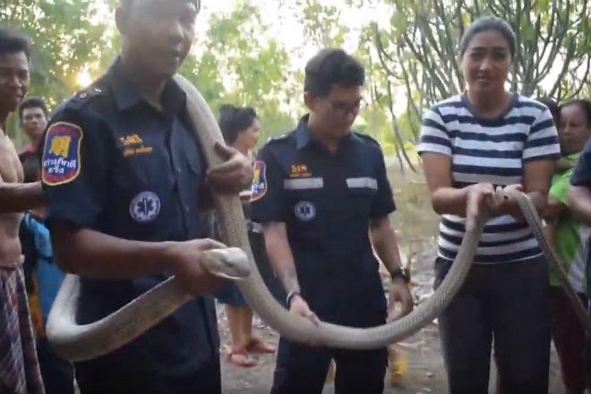 O voluntário Wutthichai Pornpermsuk, 35, conseguiu agarrar o réptil da espécie Ophiophagus hannah