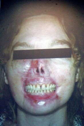 Seu amado cachorro havia mastigado a maior parte da face inferior. Ambos os lábios se foram, assim como o queixo e a maior parte do nariz, deixando um buraco sangrento onde suas feições estavam