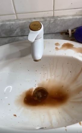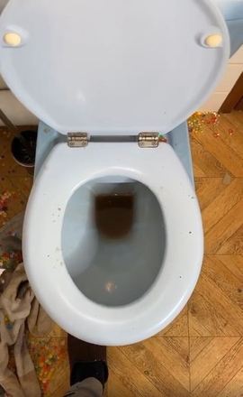 Sua próxima ideia genial foi jogar parte do material no vaso. O vaso também entupiu, claramente