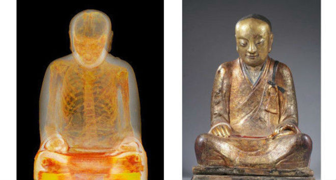 Ao colocar a estátua dentro da máquina de exames, eles acharam o corpo perfeitamente conservado de um monte budista