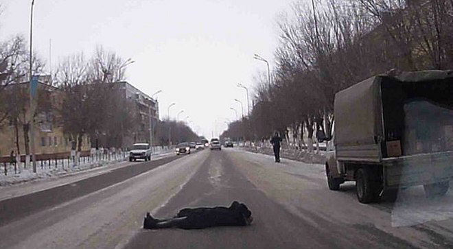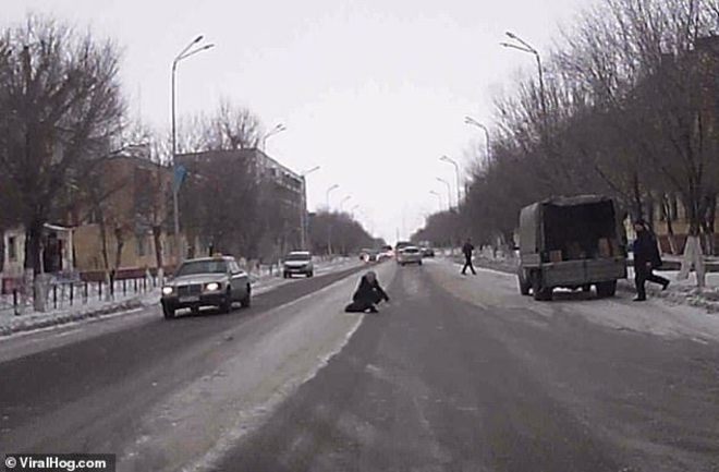 A filmagem, feita no Cazaquistão, mostra a mulher calmamente se deitando no chão enquanto um veículo se aproxima
