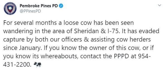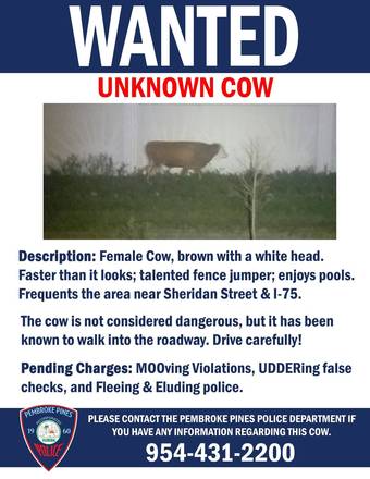 A polícia de Pembroke Pines está em uma busca implacável por essa sujeita da foto: uma vaca muito esperta e lisa. Segundo o anúncio, divulgado pelo Twitter oficial da instituição, o animal está foragido há um mês!
