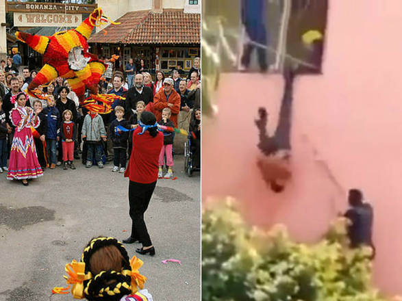 Um dos agentes subiu em uma cerca próxima e começou a agredi-lo com uma vara. Tal qual é feito com uma pinhata