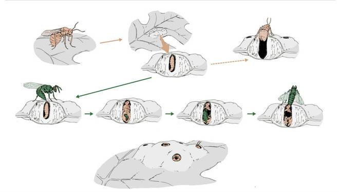 Elas fazem um buraco pequeno o suficiente apenas para retirar a cabeça do casulo, enquanto o corpo delas é devorado pelas larvas de guarda-cripta