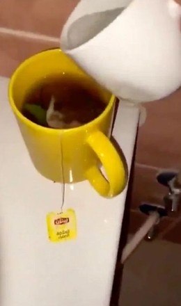 No vídeo, ele pega água do vaso e coloca em um chá de menta já pronto