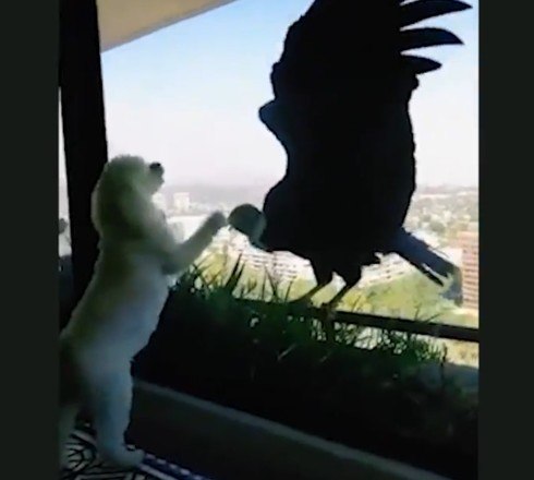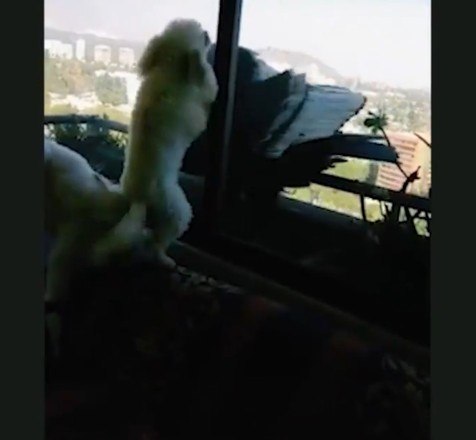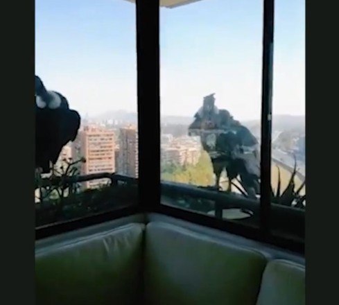 As aves até bicam a janela, chamando a atenção dos pets