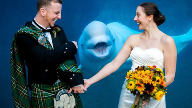 Ensaio de casal em um aquário pode propiciar cenas únicas como essa