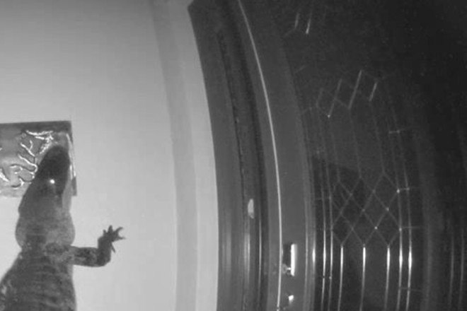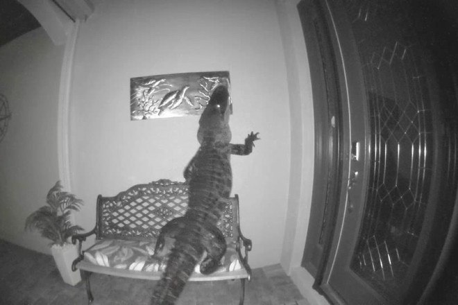 Um morador foi surpreendido por um jacaré sobre duas patas na porta da casa onde mora