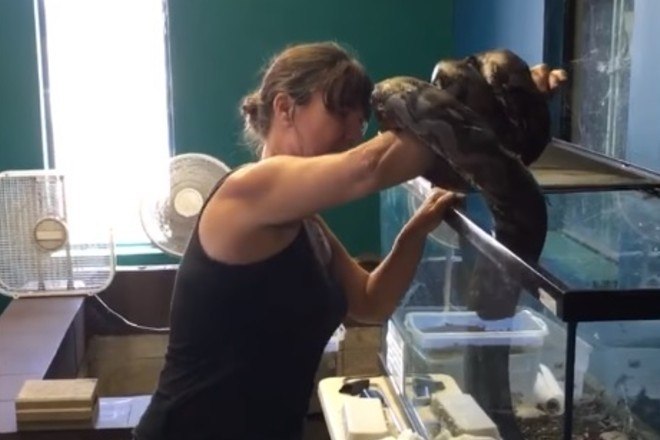 Um gancho de captura foi usado remover o réptil, momento no qual o sangue escorria profusamente pela mão da cuidadora. Barry atualizou o compartilhamento com o print de uma mensagem da profissional