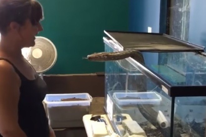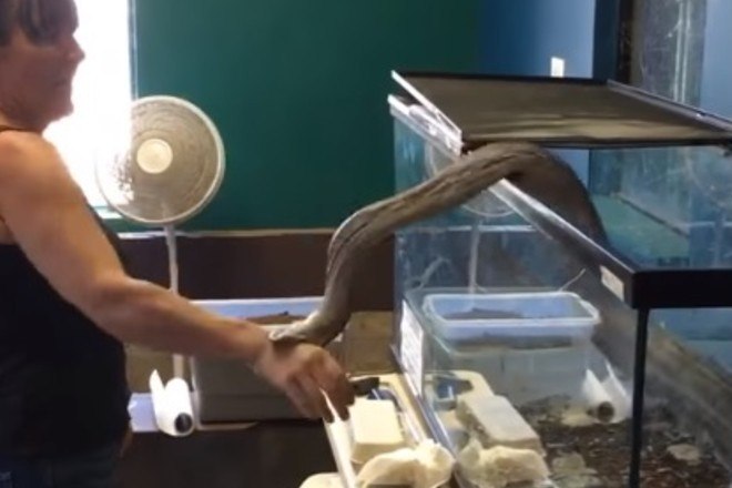 No entanto, ao entrar no "modo alimentação", como denominou o especialista, a serpente mordeu uma das mãos da cuidadora