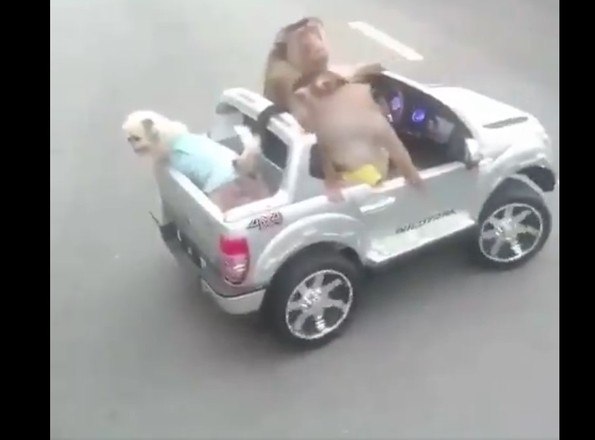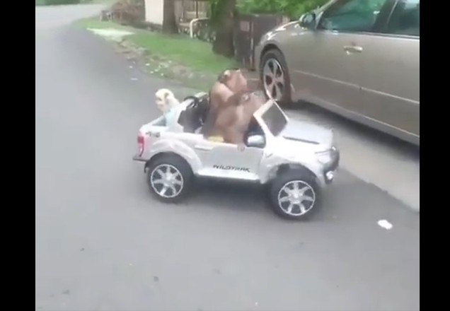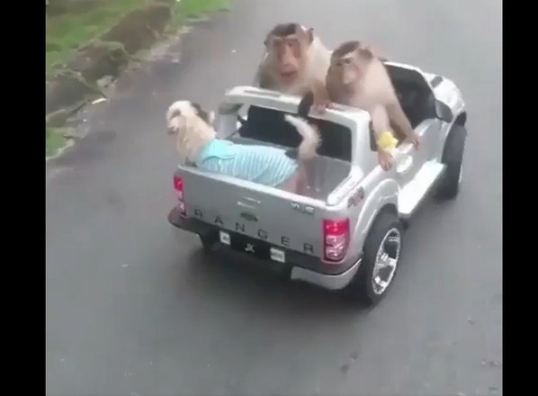 Esse é um dos vídeos mais estranhos e misteriosos que a internet já viu. Uma dupla de macacos conduz um minicarro com um poodle na traseira e até arriscam umas manobras