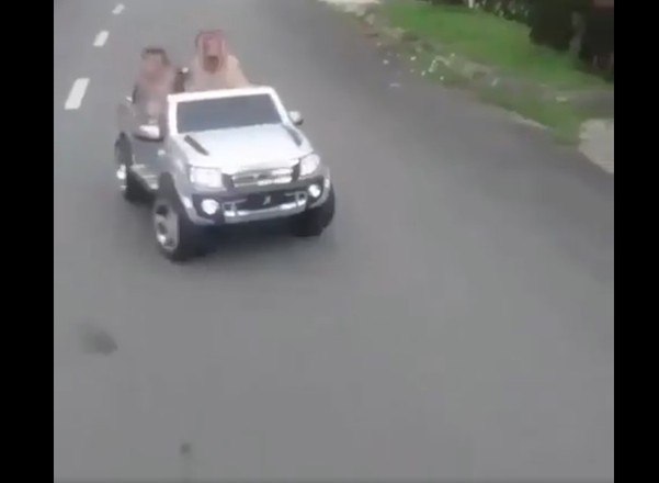 Um carro movido a bateria, uma dupla de macacos cuidadosos!