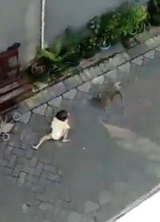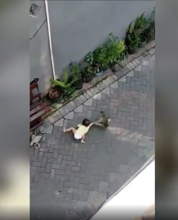 O símio desce da moto como um bandido comum e puxa uma criança que estava sentada na calçada com o irmão e a mãe