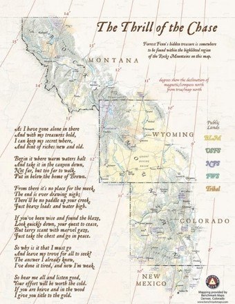 As pistas para encontrar o tesouro estavam escondidas em um poema que era parte da autobiografia do comerciante, The Thrill of the Chase, lançado em 2010