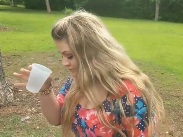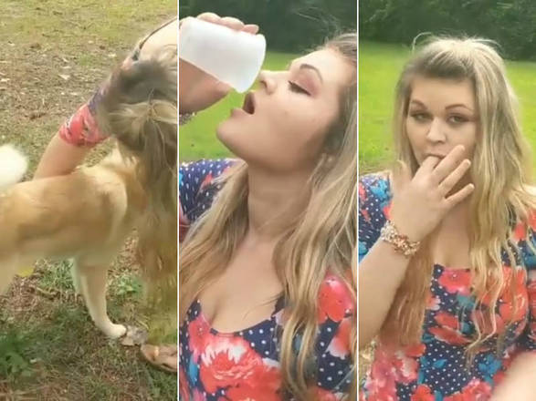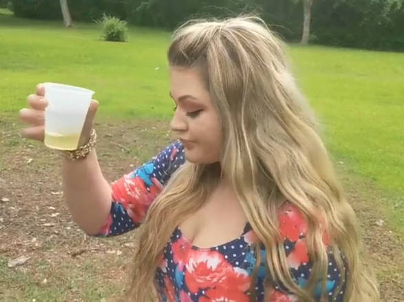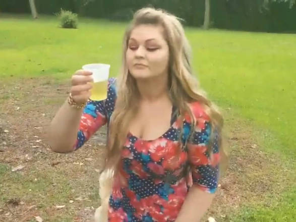 Lynn não pensa duas vezes e começa a virar o copo com a urina do cachorro