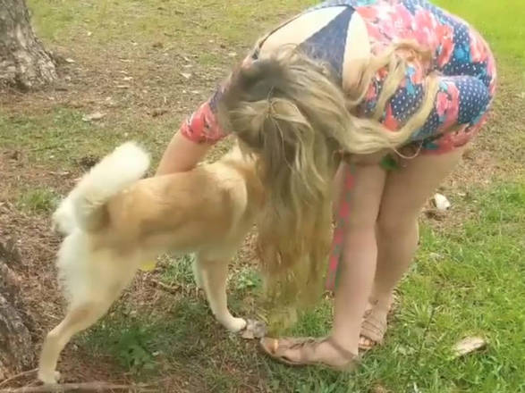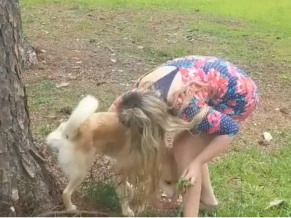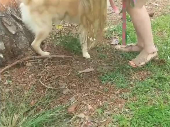 A americana então posiciona o cachorro para coletar a urina em um copinho plástico