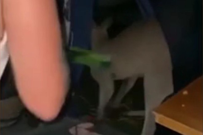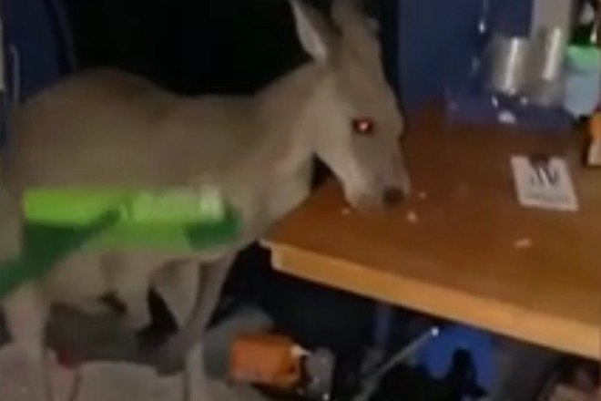 Após ameaças com uma garrafa e investidas por meio de uma vassoura, o canguru finalmente decidiu ir embora