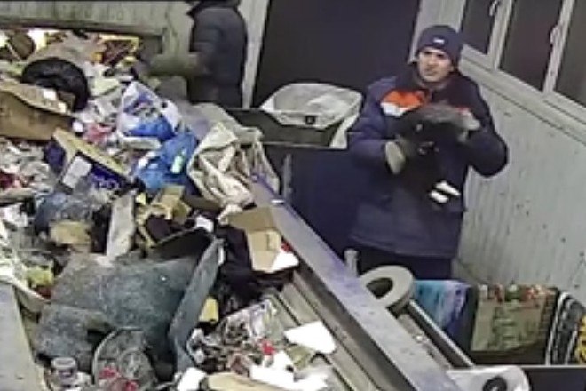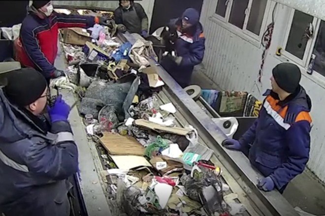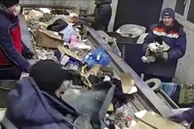 Um gato em perfeitas condições foi salvo de ser esmagado por uma máquina separadora de lixo, em um centro de triagem de detritos em Ulianovsk, na Rússia