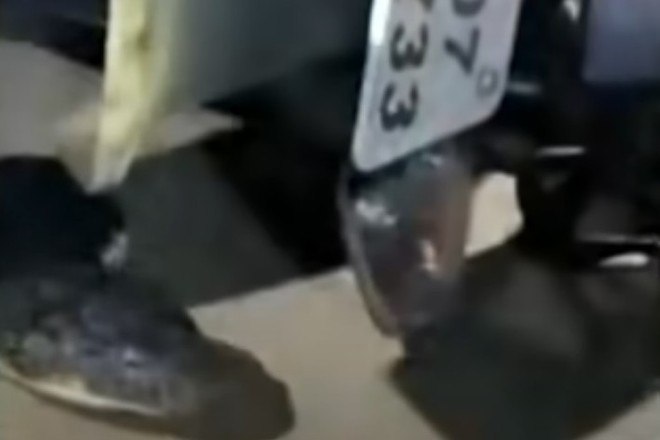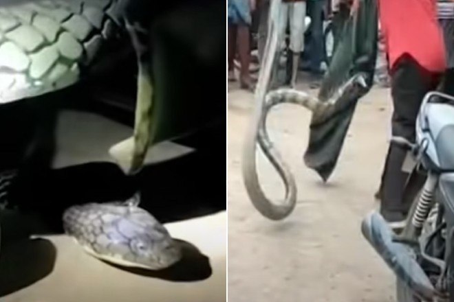Uma cobra-rei com cerca de 4 m de comprimento — equivalente ao de um Fusca — praticamente atropelou uma moto, no vilarejo de Poleru, na Índia