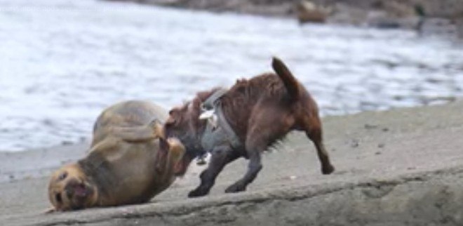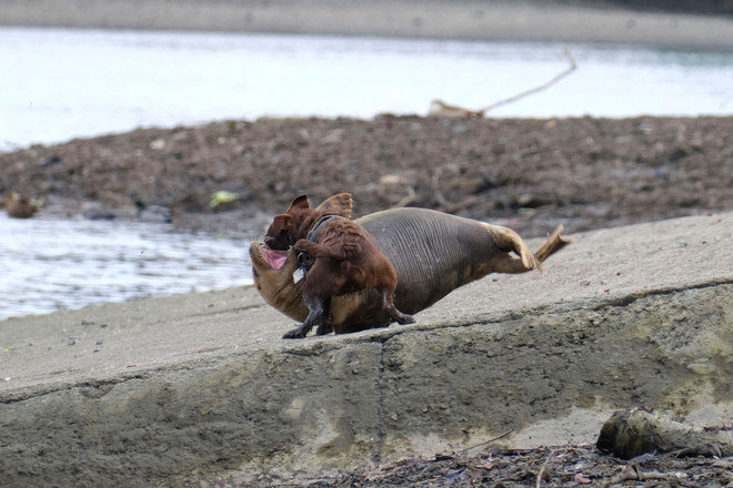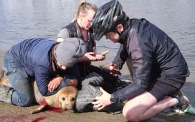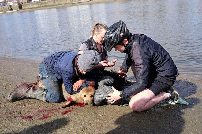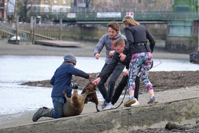 Transeuntes que estavam na orla do Tâmisa, onde a foca fixou residência, tentaram ajudá-la enquanto o cachorro cravava os dentes nela. No grupo estava Rebecca Sabben-Clare, 49 anos, dona do cachorro que andava sem coleira