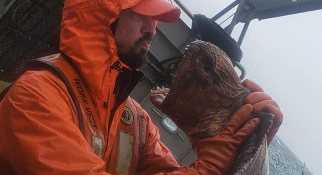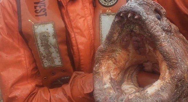 O pescador acima fisgou uma criatura assustadora para os padrões padrões humanos, durante uma incursão pelo mar de Bering, próximo à ilha de Akutan, no Alasca