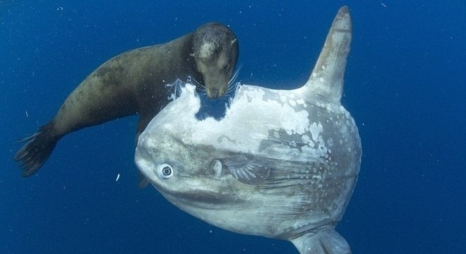 Em 2015, o fotógrafo e mergulhador Richard Herrmann capturou a rara imagem de um leão-marinho comendo um peixe-lua. O registro foi feito a 19 km da costa de San Diego, Califórnia