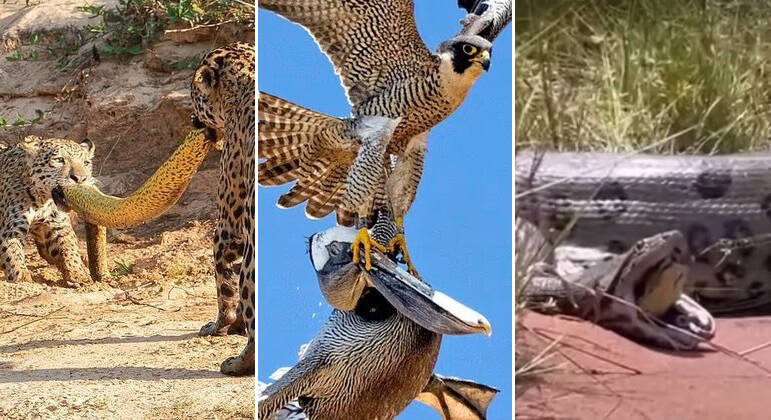 Ao longo do ano, os animais protagonizaram situações que, se não fossem registradas, ninguém acreditaria. Onças fizeram uma espécie de cabo de guerra com uma sucuri. Já outra sucuri foi regurgitada por uma companheira da espécie. E, pelo ar, um falcão tretou feio com um pelicano. A seguir, confira os flagrantes mais selvagens de 2023!Nos últimos instantes de vida, uma sucuri-amarela (Eunectes notaeus) foi feita de "cabo de guerra" por uma mãe e um filhote de onça-pintadaDe acordo com o perfil do Twitter Biodiversidade Brasileira, a sequência de tirar o fôlego é assinada pelo fotógrafo Michel Zoghzhog e teve como palco uma região não especificada do pantanal, no Centro-Oeste do paísLEIA AQUI A MATÉRIA NA ÍNTEGRA!Uma sucuri menor sobreviveu depois de ter sido regurgitada por uma sucuri maiorO flagrante impressionante foi registrado em algum lugar não especificado do Centro-Oeste brasileiro e compartilhado no YouTube pelo biólogo Henrique, conhecido como "o biólogo das cobras"SAIBA AQUI O DESFECHO DA HISTÓRIA!Um falcão-peregrino (Falco peregrinus) mostrou que tamanho não é documento na natureza e aplicou uma surra bem dada em um pelicano imenso que chegou perto demais da área de nidificaçãoAs imagens foram registradas por Decker Nomura, um carteiro que passava pela praia de Torrey Pines, na Califórnia (EUA). Ele publicou tudo no Instagram logo depois"Quando o pelicano se aproximou da área de nidificação dos falcões-peregrinos, um falcão-macho alerta se preparou para defender seu ninho", afirmou Decker em entrevista à agência Solent NewsA testemunha acrescenta que o pelicano provavelmente não queria fazer mal ao ninho, mas o falcão não interpretou dessa formaVEJA AQUI A GALERIA COMPLETA!